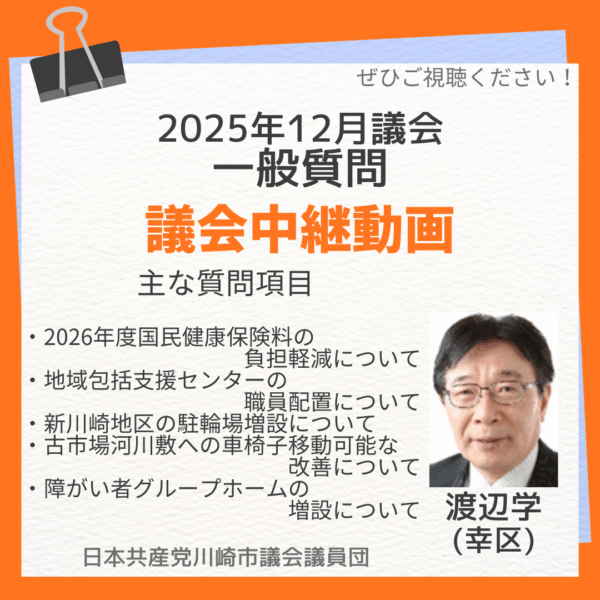 2025年12月19日の川崎市議会定例会で、渡辺学議員が一般質問を行いました。主な内容は以下の通りです。